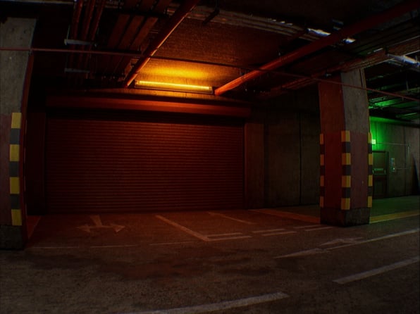 Level 1 — a huge spacious warehouse/parking lot with concrete floors and walls, and a low-hanging fog, the source of which is unknown. It leaves condensation, creating puddles on the floor in various parts of the level. The level space is more diverse than the previous level: there are elevators, stairs, separate rooms and corridors on the level.